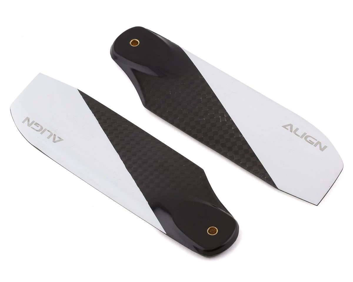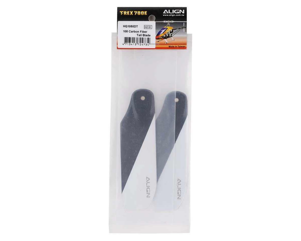 This is a set of Align 105mm Carbon Fiber Tail blades, with an updated style that offers improved visibility due to the larger white section found at the tip of the tail rotor blade. These are designed for the T-Rex 700 series of helicopters, but can be used with other helicopters that use this size of tail rotor blade.