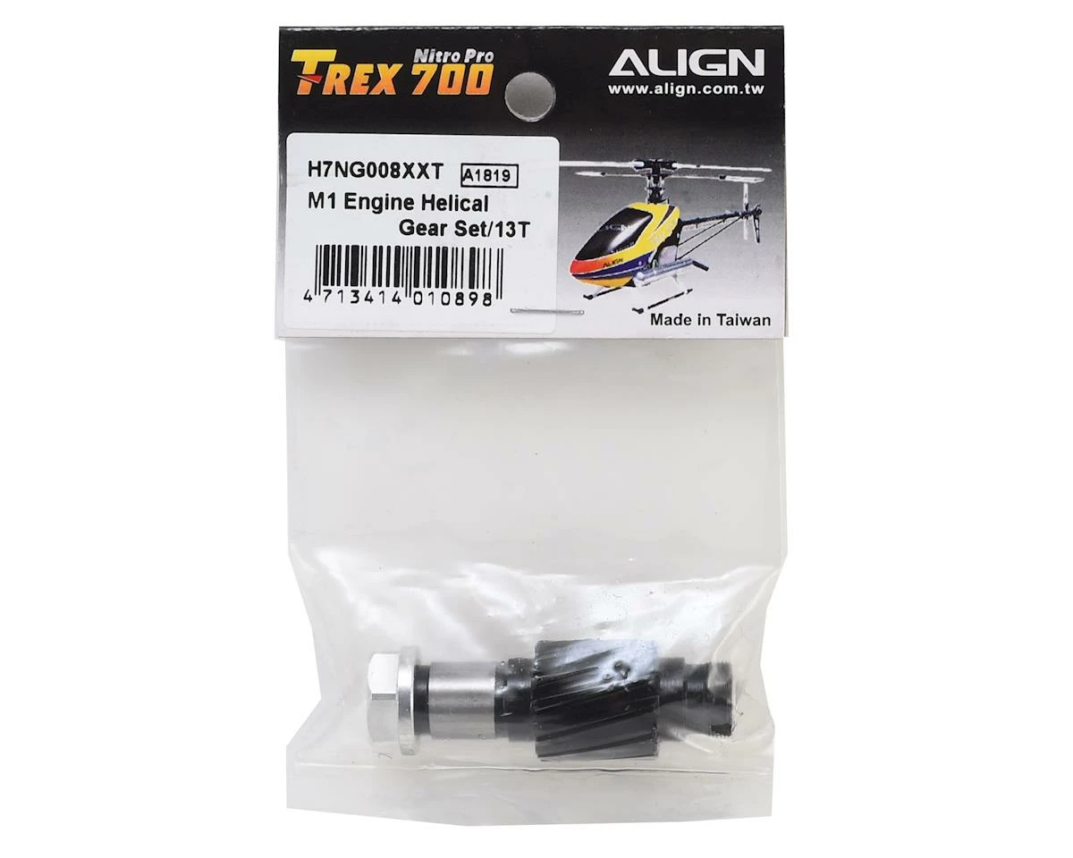 This is a replacemeng Align Mod 1 13T Helical Engine Pinion Gear, suited for use with the T-Rex 700XN helicopter.