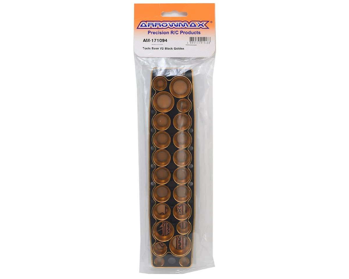 The Arrowmax Black Golden Edition Tool Base helps to clean up and organize your work space. The Version 2 design features a slot for the popular Arrowmax Multi Shock Clamp (AMX-190031) and the V2 line of Turnbuckle wrenches. Designed to fit four 22mm handles (7mm Socket Driver, Reamer etc.), four 14mm handles (60mm Tools), twelve 18mm handle tools, plus Multi Shock Tools and three V2 Turnbuckle wrenches, this tool stand makes it easier than ever to keep your tools within easy reach. One base, 24 tools!