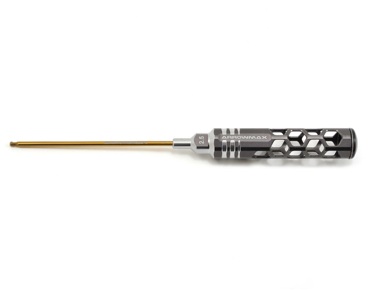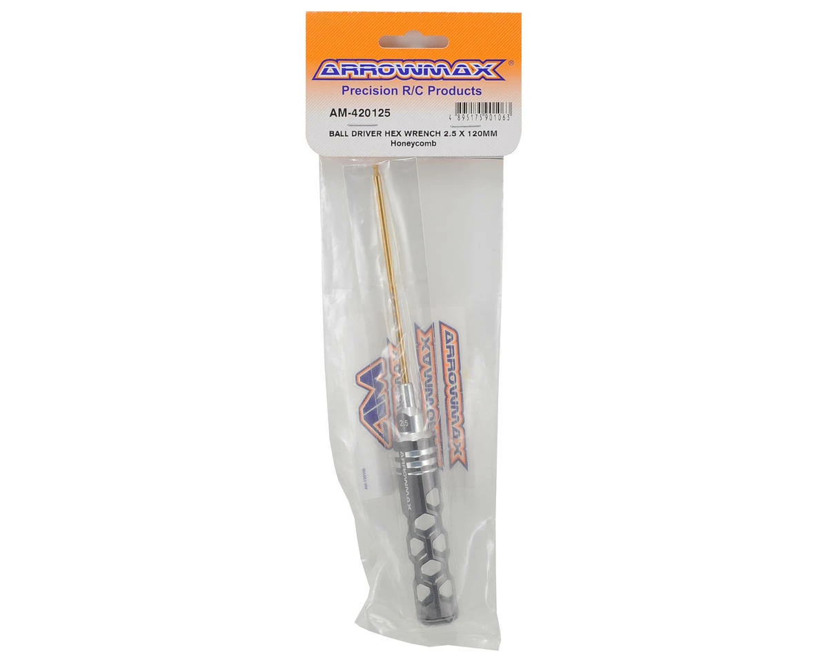 This is an Arrowmax 2.5mm Honeycomb Ball End Hex Wrench. Arrowmax tools feature an eye-catching, light weight, hollow honeycomb handle design. The 120mm long tips are spring steel and titanium nitride coated for durability. When combined with the lexan cap, you get a comfortable, controllable and lighter feeling tool that makes wrenching easier.