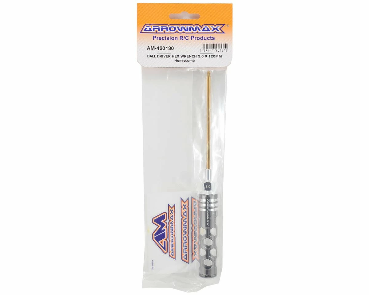 This is an Arrowmax 3.0mm Honeycomb Ball End Hex Wrench. Arrowmax tools feature an eye-catching, light weight, hollow honeycomb handle design. The 120mm long tips are spring steel and titanium nitride coated for durability. When combined with the lexan cap, you get a comfortable, controllable and lighter feeling tool that makes wrenching easier.