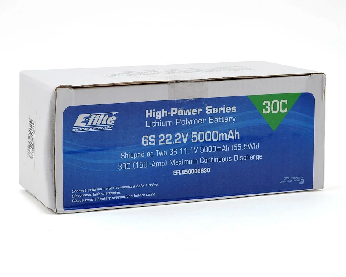 This is an E-flite 6S, 30C, 5000mAh Li-Poly Battery Pack, with an EC5 connector. High-Power Series Lithium Polymer Batteries offer an excellent blend of weight, power and performance. Available in a wide variety of capacities and voltages, there’s a battery perfect for almost any application, from indoor slow flyer to large-scale sport and aerobatic airplane models as well as micro to mid-sized helicopter models.