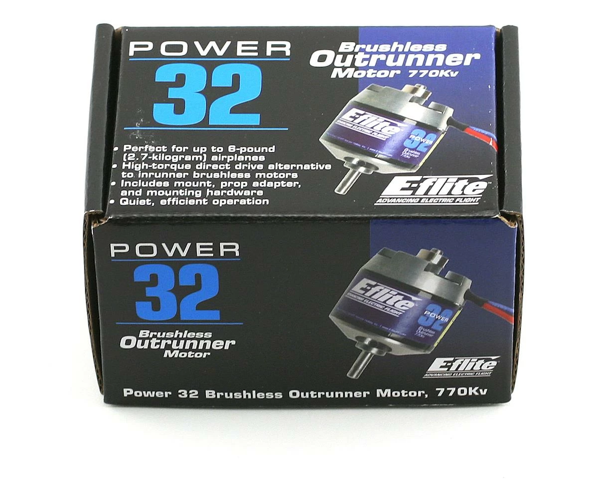 This is the E-flite Power 32 Brushless Outrunner Motor, 770 kV. The Power 32 is designed to deliver clean and quiet power for 30- to 36-size sport and scale airplanes weighing 3.5- to 6-pounds (1.6- to 2.7-kilograms) 25- to 36-size 3D airplanes up to 4.5-pounds (2-kilograms), or models requiring up to 700 watts of power. Its especially a good match for the Gee Bee Tiger Moth, TopFlite DC-3, Phoenix Sonic 25 and 3D airplanes such as the E3D.
