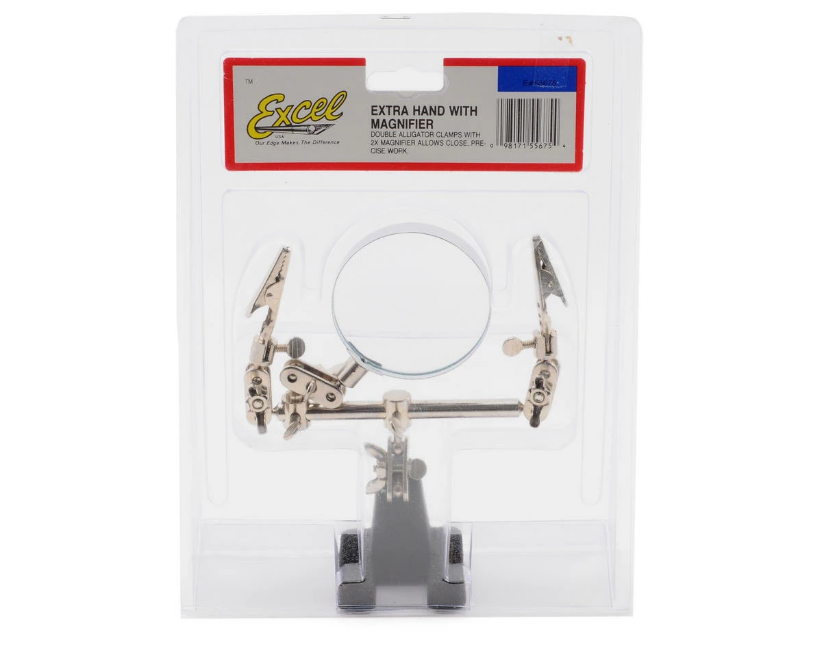 Has two spring-loaded alligator clips mounted on ball joints to hold parts at any angle, leaving hands free to work on your project. Features include wing nuts on a ball joints for ease of positioning and weighted base to give stability, and a 2X glass magnifier to assist in working on intricate projects.