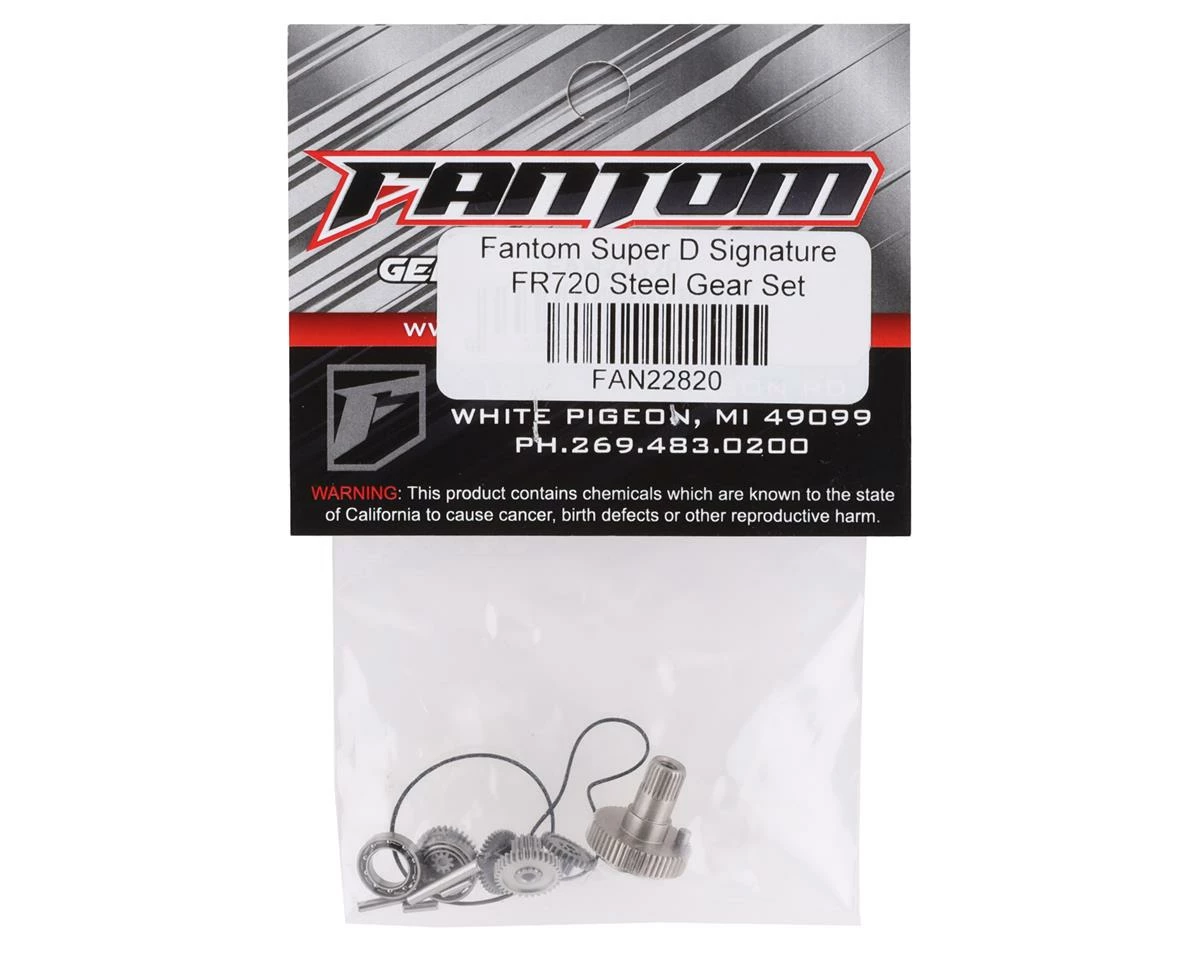 Fantom FR720 Steel Servo Gear Set. This replacement gearset is intended for the Fantom FR720 (FAN22720). Package includes one set of servo gears, three O-Rings, two bearings and two pins.
