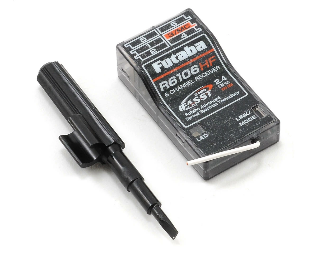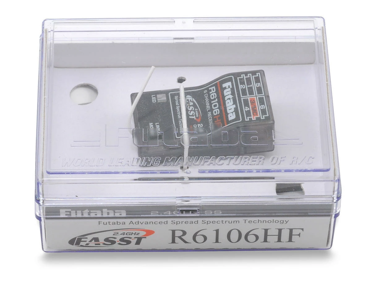 This is the Futaba R6106HF 6 Channel 2.4Ghz FASST Park Flyer Receiver. This receiver is a perfect match for park flyers, indoor models and helis up to 500mm. A 7ms frame rate gives this receiver extremely low latency, for virtually real-time response, and it is compatible with any servo in normal mode, or high speed mode with digital servos. The End pin design offers quick and easy installation, and the Easy Link™ does away with binding plugs
