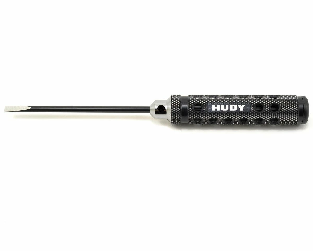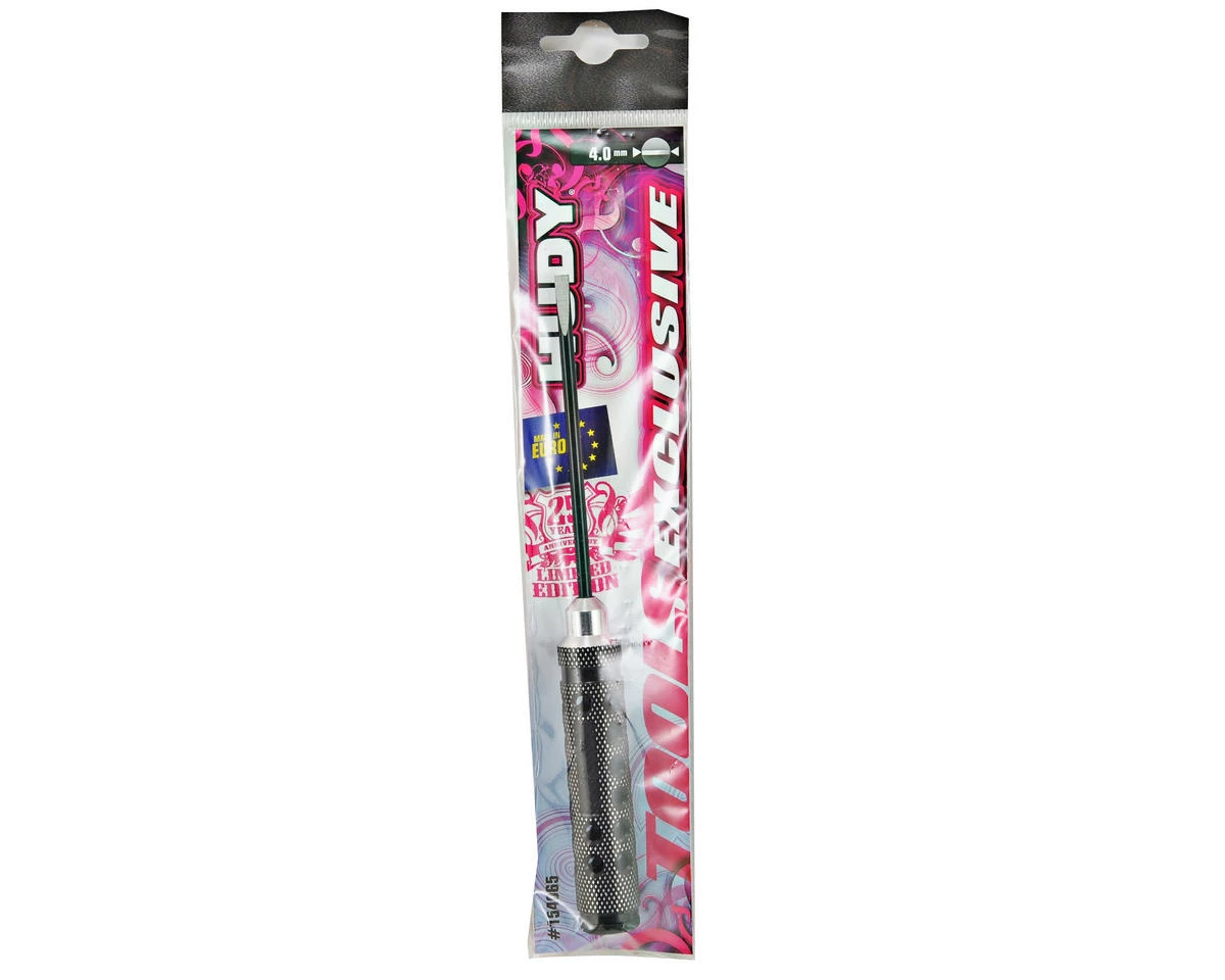 This is the Hudy Limited Edition Long 4mm Slotted Tuning Screwdriver. This screwdriver is intended to be used for engine tuning purposes. Featuring a super-lightweight CNC-machined Swiss 7075 T6 aluminum handle with a diamond pattern surface for unsurpassed grip. The handle includes a black plastic cap press fit into the handle end. Optional color-coded plastic caps (violet, red, blue) are available to customize the tools to your specifications.