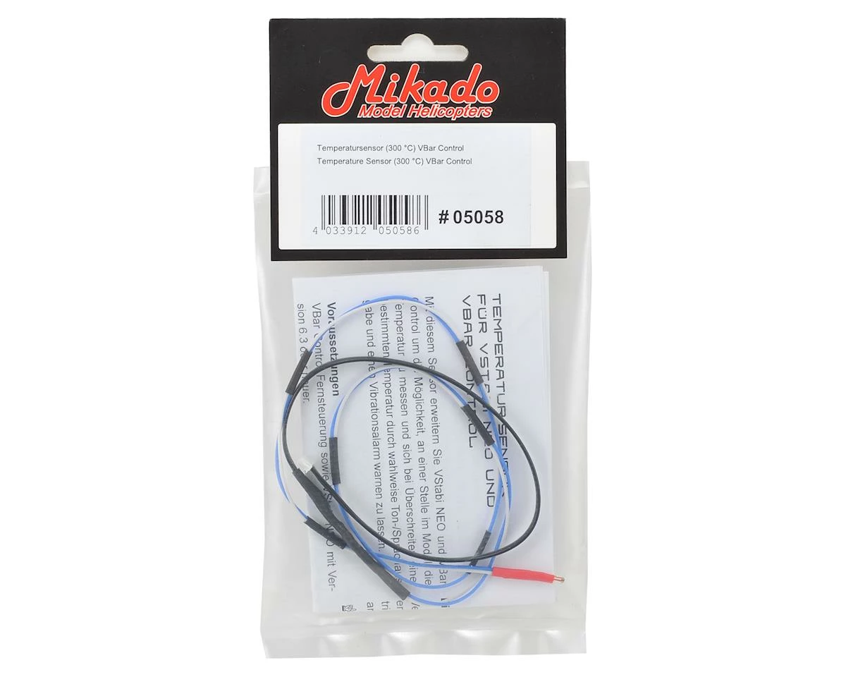 The Mikado Nitro Temperature Sensor for Vbar Control radio allows pilots to monitor their nitro engine temperature while in flight. Once the Vbar Neo is running Firmware V6.3 or higher, and the app is loaded on the VBar Control, the sensor will be autodetected by the system. Once installed, temperature warnings are able to be configured by the pilot along with warning types such as voice or vibration.