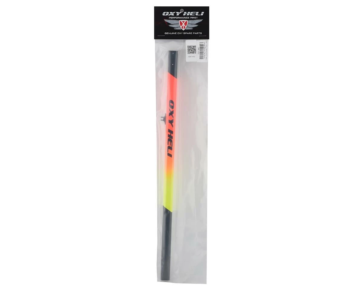 This is an optional Oxy Heli Oxy 4 Max Tail Boom, painted in a yellow & orange livery for increased visibility. Suitable for the Oxy 4 Max helicopter.Â