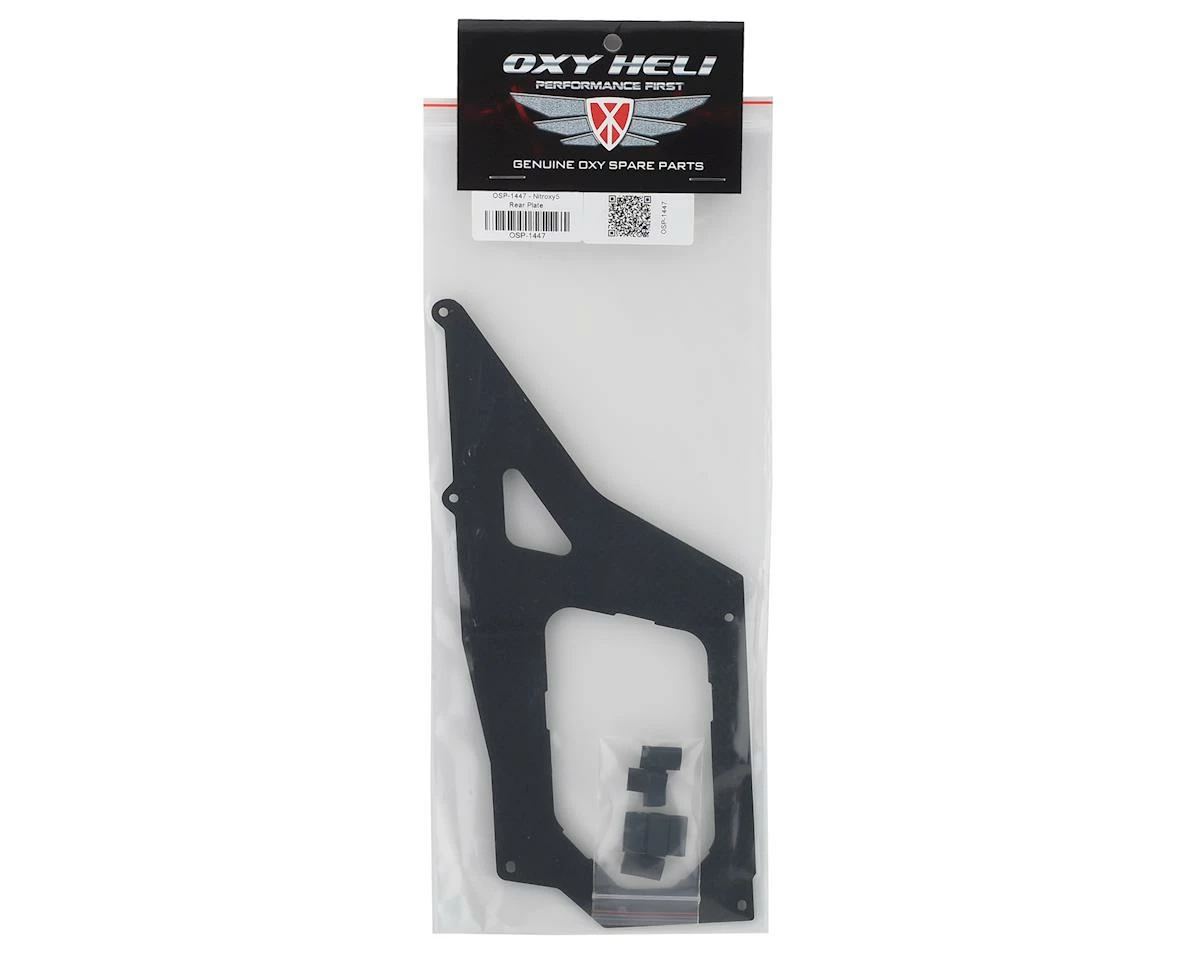 This is a replacement Oxy Heli Oxy 5 Rear Plate, intended for use with the Oxy 5 Nitro Helicopter Kit.