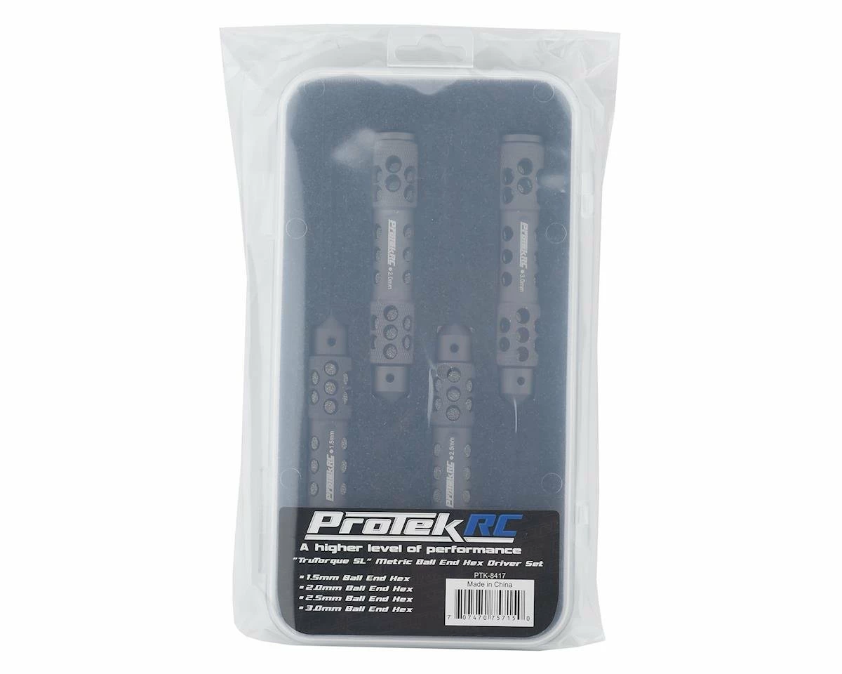 The ProTek R/C “TruTorque SL” Metric Ball End Hex Driver Set features large 20mm diameter handles with machined relief holes and cross hatch knurling to reduce weight and provide a high grip surface. The end of the handle features a rotating end cap that allows the tool to spin in your palm, maximizing comfort during long wrench sessions. Plus, the tip size is laser etched in not one – but the THREE different spots on the handle to help simplify identification.