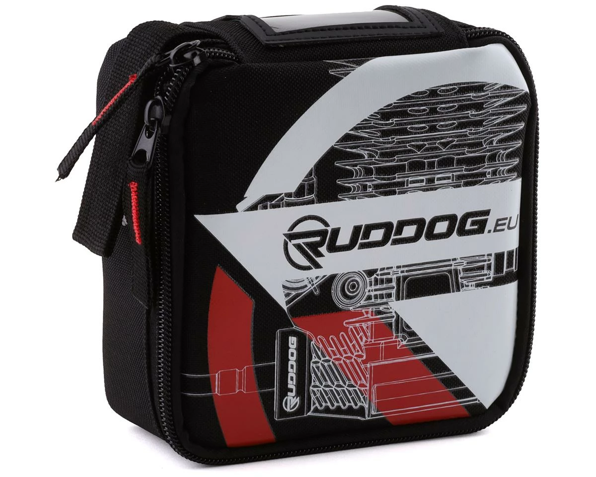 This is a Ruddog Nitro Engine Bag is a practical yet decorative way to store or carry a single nitro engine. The sturdy bag is made of tough fabric, it features the proud red, black and white signature RUDDOG colors, a high-quality print and a durable zipper, ensuring the bag will last nearly forever. The inner foam piece comes pre-cut to accept a single 3.5cc nitro engine but it can also be removed to carry all sorts of accessories. A fabric loop rounds out the package, ensuring easy carrying of the bag.