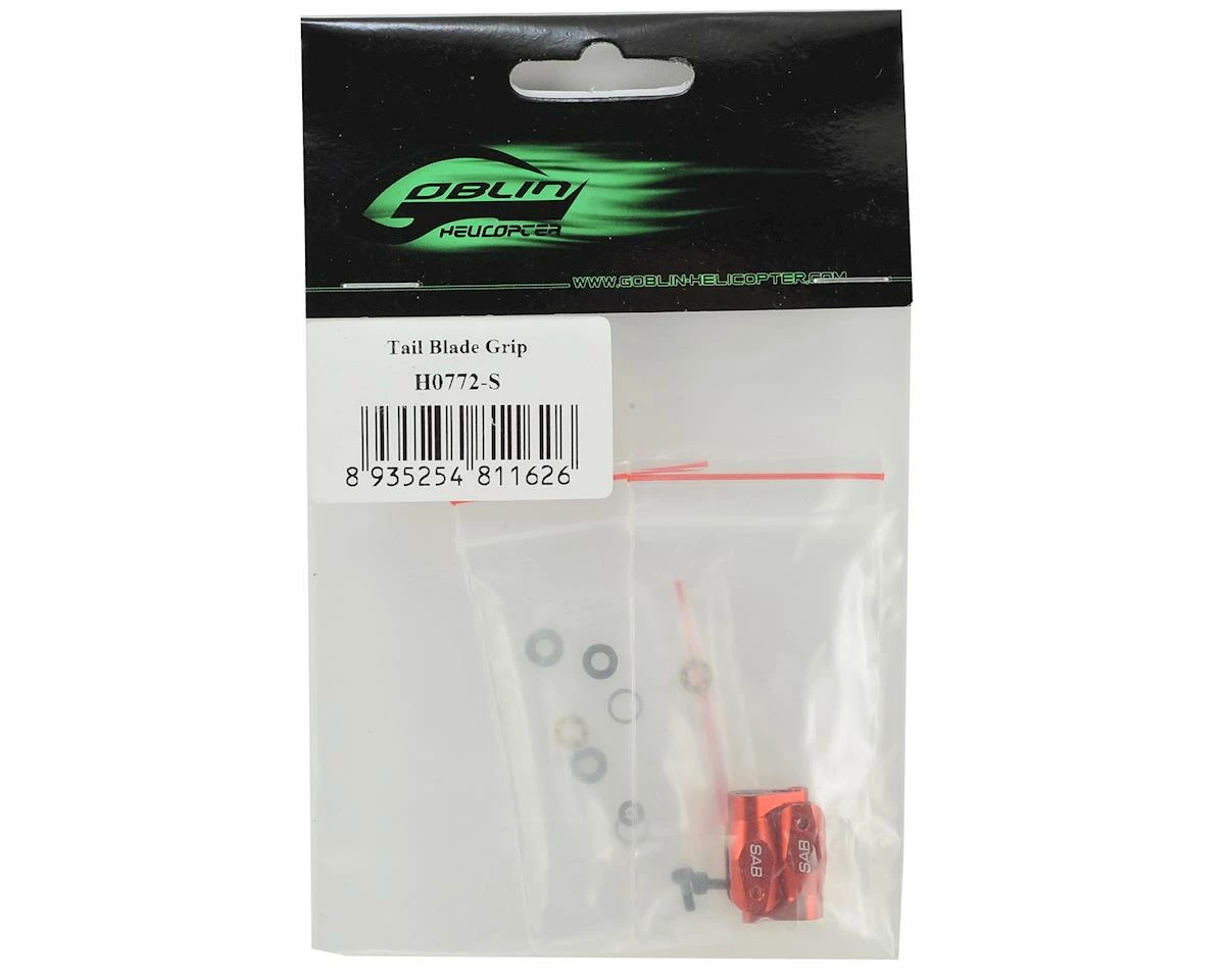 This is an optional SAB Aluminum Tail Blade Grip Set, in red anodized color. The package includes all the required hardware to install this onto the Goblin Fireball or Goblin Mini Comet.Â