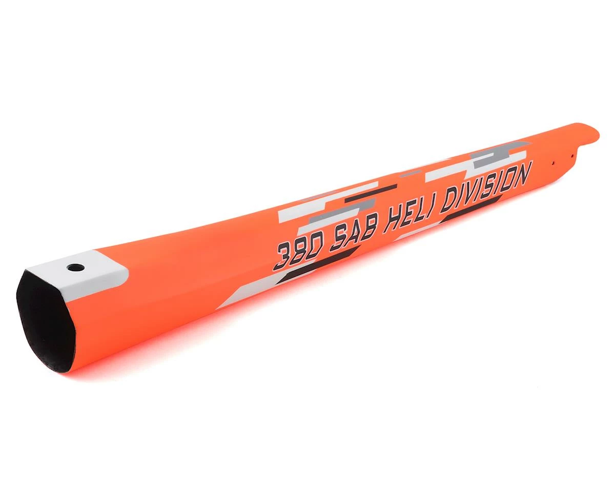 This is a replacement SAB Goblin 380 Buddy Tail Boom, painted in the original orange, black, and white livery.
