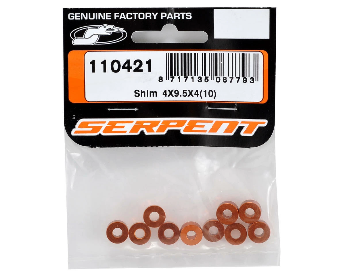 This is a pack of ten replacement Serpent 4×9.5x4mm Aluminum Shims, and are intended for use with the Serpent S811 Cobra GT 1/8 on road car.