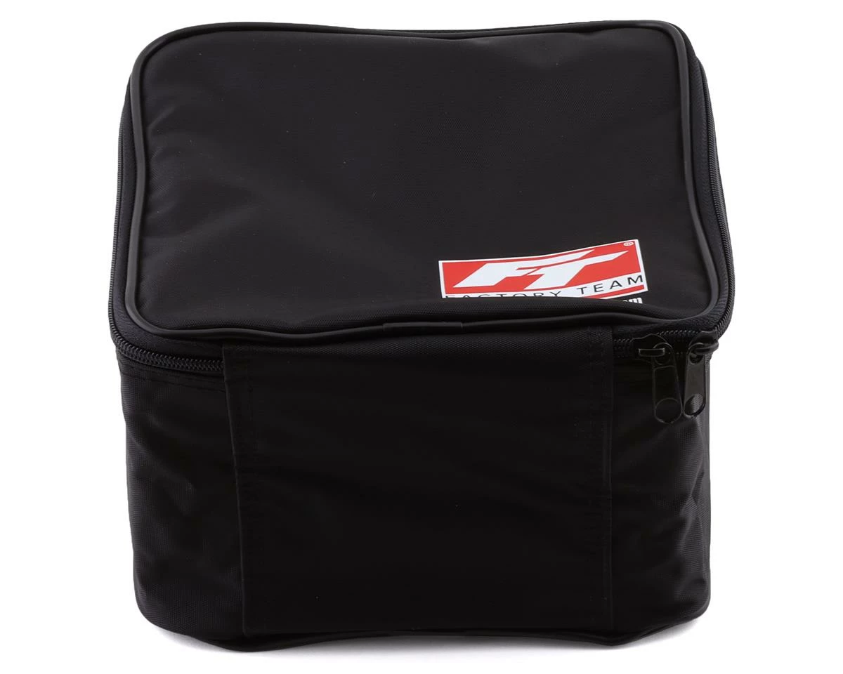 The Team Associated Factory Team Fluid Carrier Bag measures 8x8x5.25″ (203x203x134mm), and is a great option to carry up to sixteen of your favorite fluids in neat compartments. The zipper enclosure keeps contents secure, the top flap’s inner pocket adds extra storage, and the fabric handle makes carrying comfortable. Inner dividers can be removed to store alternate items, if desired. The prestigious Factory Team logo on the top positions this carrier bag in a league of its own.