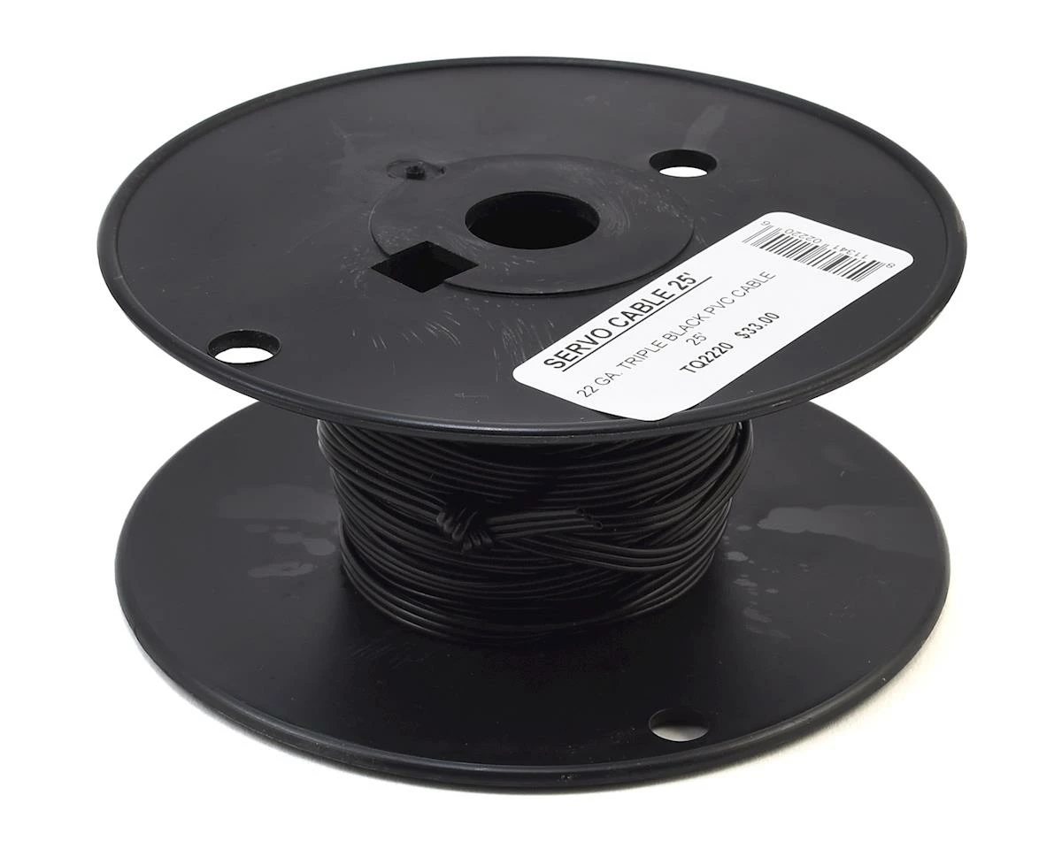 This is the TQ Wire 22awg Triple Black Servo Wire Spool. This 25 foot roll of 22awg servo wire is all black and ready for custom wiring projects.