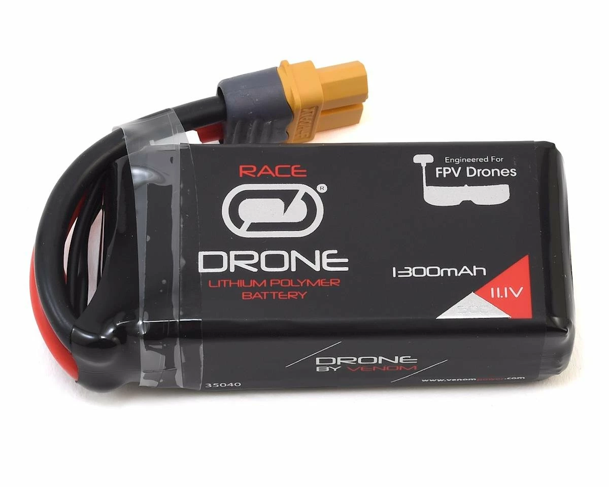 This Venom DRONE 50C 3S 1300mAh 11.1V FPV Race series lithium-ion battery is 5C fast charge capable, allowing you to charge up to five times faster and boasts a 100C (130A) burst rate. Venom DRONE FPV Race series LiPo batteries are engineered for the extreme demands of FPV racing pilots. Venom has over a decade of lithium-ion battery manufacturing experience and only uses the best LiPo materials, technology and cells available.